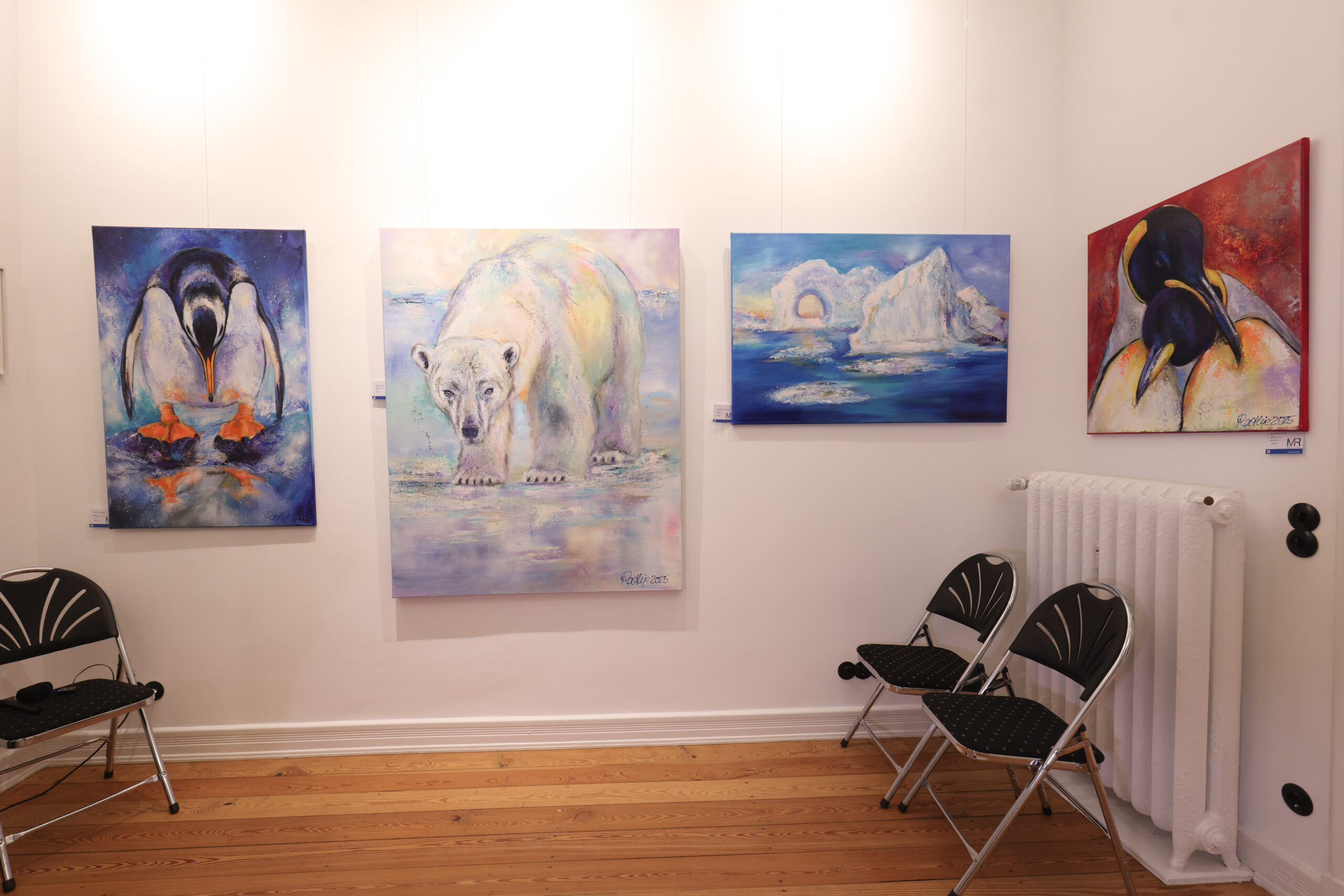 Erst kürzlich war Manuela Rathje von ihrer Expedition mit Poseidon Expeditions aus der Antarktis zurückgekehrt – einer der entlegensten und zugleich beeindruckendsten Regionen der Erde. Die Eindrücke aus Eis, Weite, Stille und Licht wirkten noch spürbar nach und verliehen dem Abend eine besondere Tiefe. Während draußen winterliche Temperaturen herrschten, entschieden sich die Gäste bewusst für die warme Alternative: Kunstgenuss, Gespräche und Inspiration in behaglicher Galerieatmosphäre.