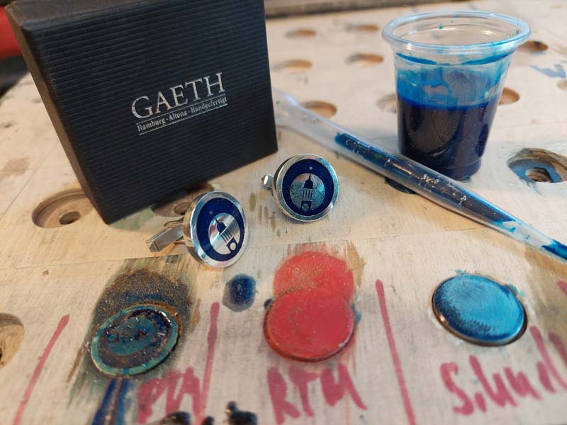„Die Manschettenknöpfe aus Silber und mit Emblemen in fünf Farben fertigt ein Freund von mir, Manuel Bohm, in meiner Werkstatt an“, sagt Kai Gaeth. Die befindet sich in einem Hinterhof in der Mörkenstraße 57a. Ohne telefonische Vereinbarung sollte man sich dort allerdings nicht hinbegeben! Zum einen ist nicht immer jemand vor Ort, zum anderen wird selten etwas für den direkten Verkauf angeboten.