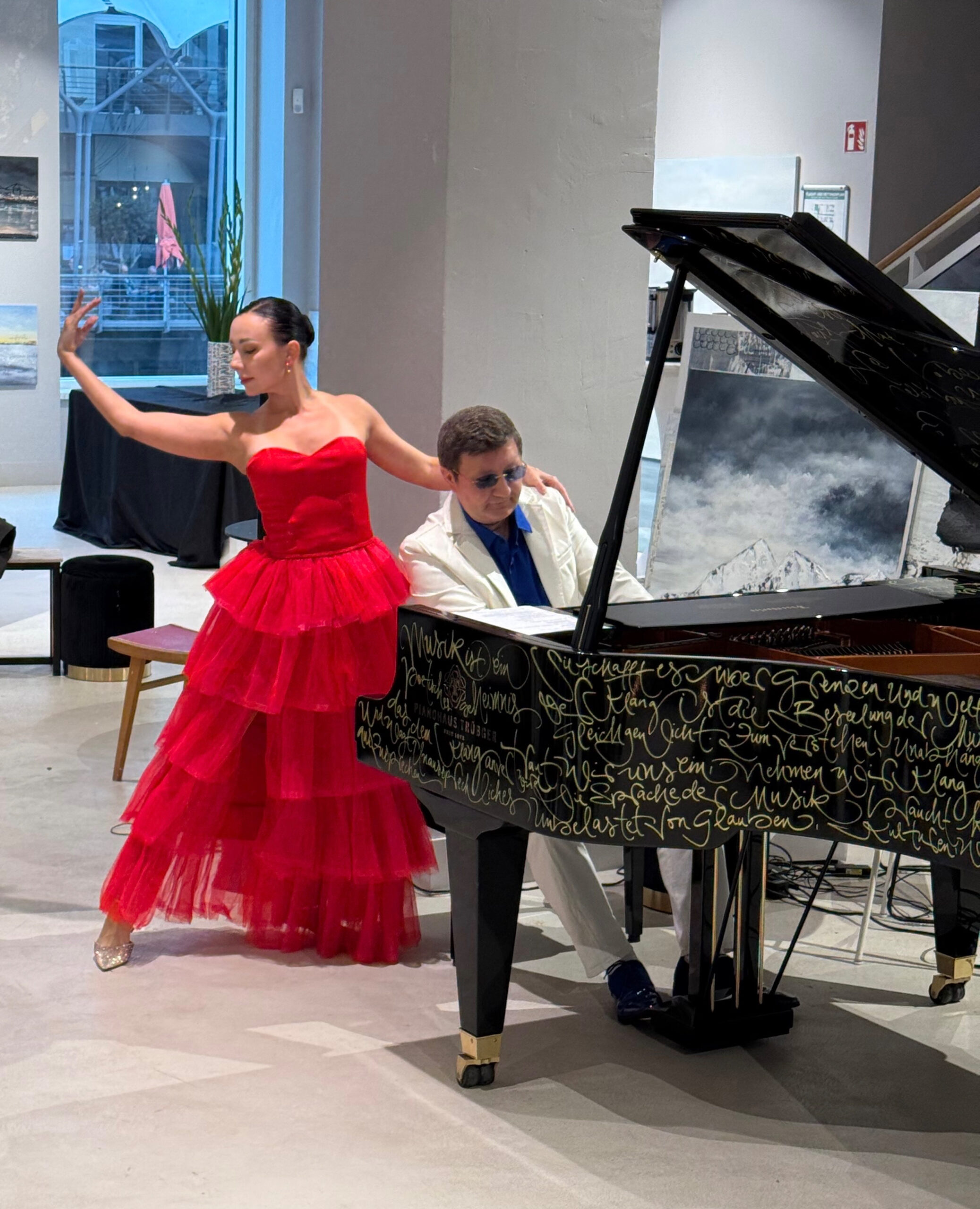 Boris Kosak am Flügel, Svetlana Font Martí an der Violine, Katarina Kubiz im Tanz, Ludmila Junghans’ Kleider in Bewegung – und Jeannine Platz, die in diesem Moment das vollendete Bild erschuf.